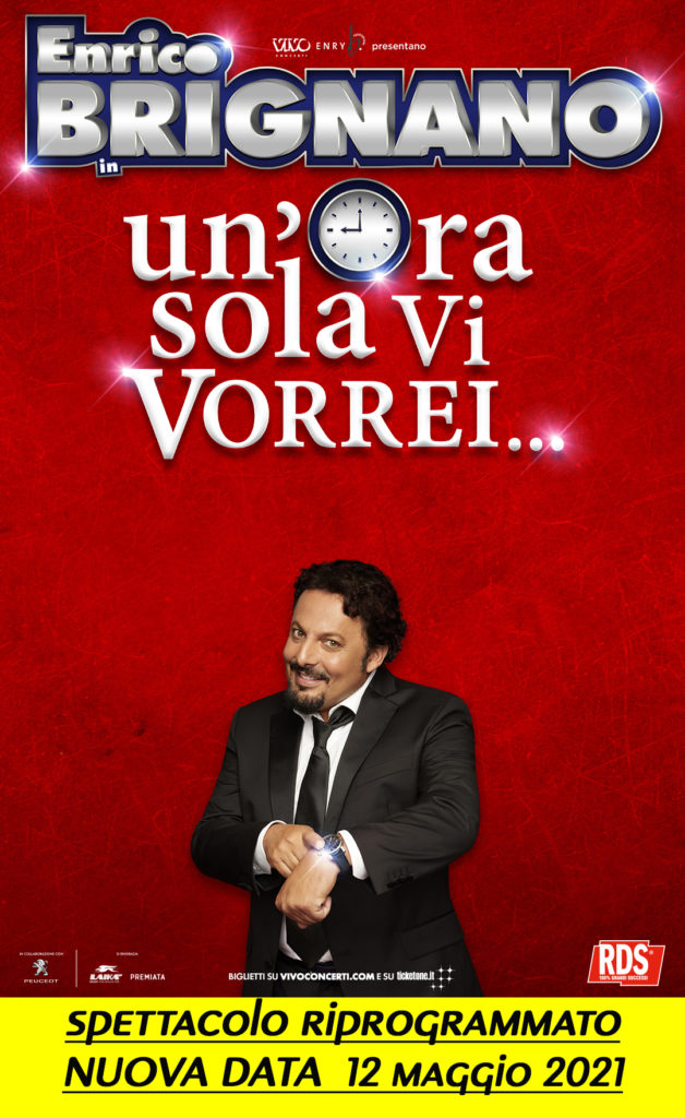 - Enrico Brignano “Un’ora sola vi vorrei“ (data originaria 13/5 e rinviato al 3 aprile 2021) è stato riprogrammato mercoledì 12 maggio 2021 ore 21.15 per motivi indipendenti dalla volontà dell’artista. .