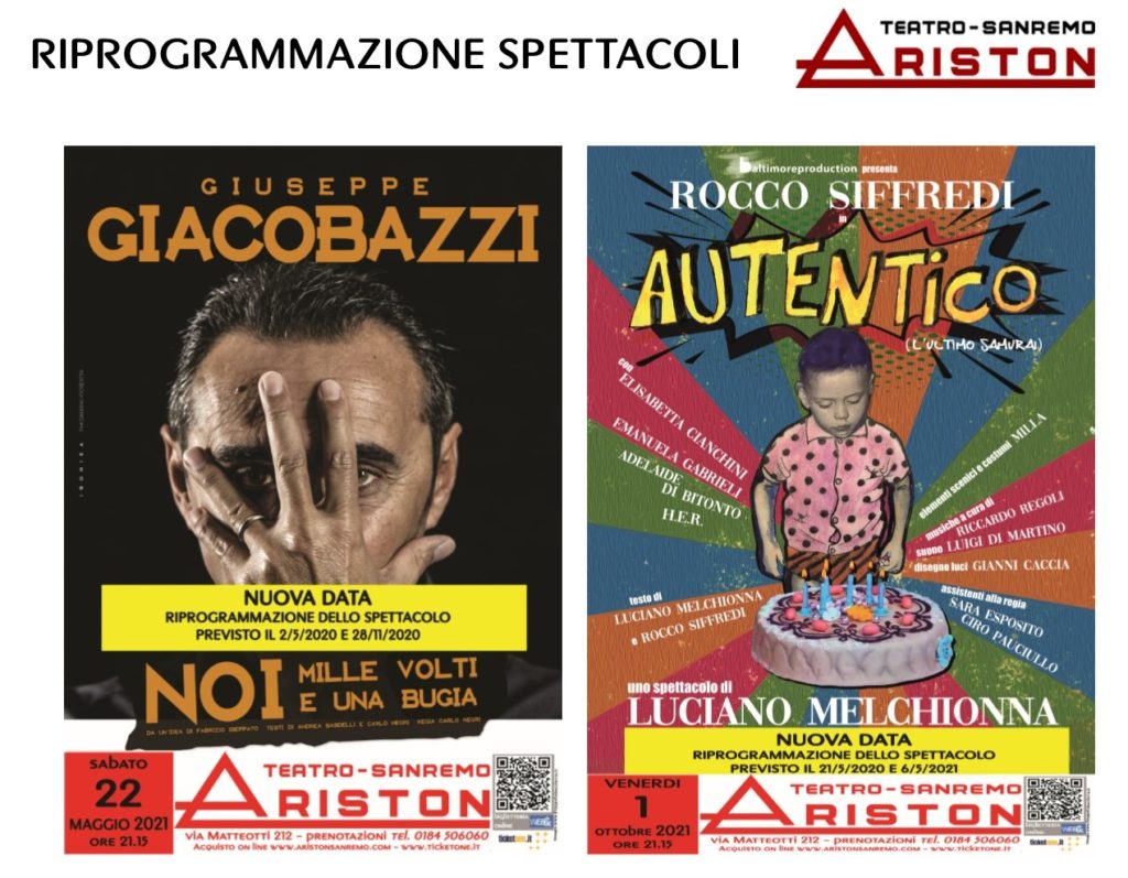 Si comunica la riprogrammazione degli spettacoli del Teatro Ariston come segue:
