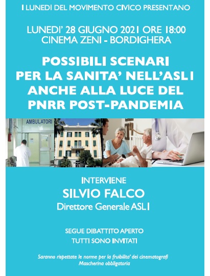 Il 28 Giugno alle ore 18:00 al Cinema Zeni i Lunedi del Movimento Civico ospiteranno il Dott. Silvio Falco, dal 1º Gennaio 2021 Direttore Generale dell’ASL1, per un incontro dal titolo “Possibili scenari per la Sanita’ nell’ASL1 anche alla luce del PNRR post-pandemia”.