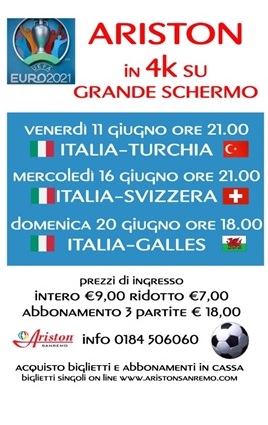 Si comunica che, l’Ariston proietterà in diretta le partite dell’Italia agli Europei di Calcio per la prima volta in 4K su grande schermo .