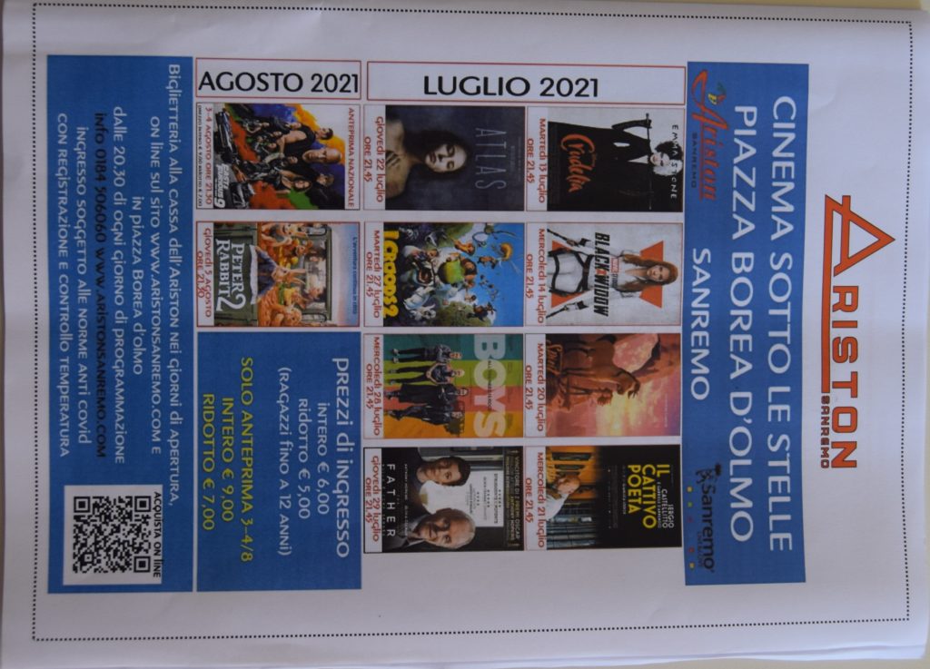 La sinergia tra Teatro Ariston e Comune di Sanremo rappresenta un punto di forza per la programmazione turistica della città dei fiori, ai turisti ed ai residenti viene offerta la possibilità di assistere all’aperto alle proiezioni di film della stagione 2021 ed inoltre ad alcune Anteprime Nazionali in Piazza Borea D’Olmo.