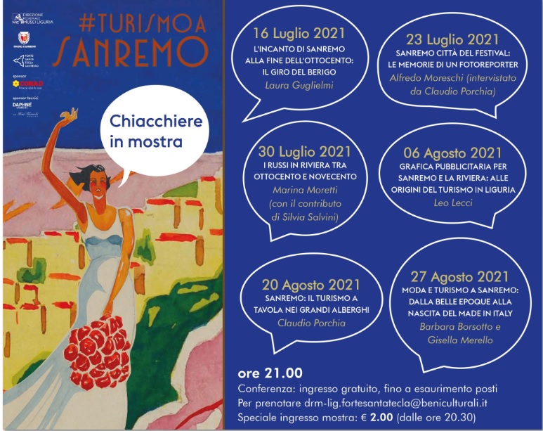 Dal 16 maggio al 27 agosto sei serate di incontri in mostra per scoprire storie e approfondimenti su Sanremo e la grande storia del turismo. Un programma a più voci che affianca la mostra #turismoasanremo al Forte Santa Tecla dove manifesti, filmati, fotografie e documenti d’epoca raccontano la straordinaria affermazione di Sanremo dalla fine dell’Ottocento agli anni ’50.