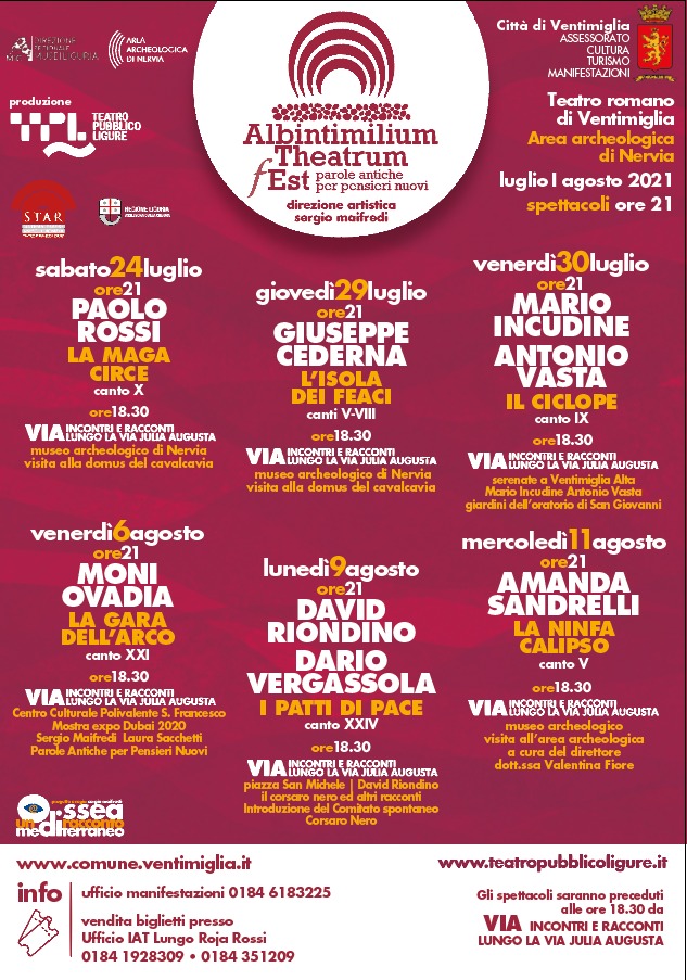 Nasce il Festival Albintimilium Theatrum fEst, prodotto da Teatro Pubblico Ligure con la direzione artistica di Sergio Maifredi, che entra nella rete STAR Sistema Teatri Antichi Romani. Sono sei spettacoli sull’Odissea in scena nell’Area archeologica di Nervia dal 24 luglio all’11 agosto 2021 con Paolo Rossi, Giuseppe Cederna, Mario Incudine e Antonio Vasta, Moni Ovadia, David Riondino e Dario Vergassola, Amanda Sandrelli. Ognuno inizia alle ore 21 ed è preceduto, alle ore 18.30, nella Chiesa di San Michele e all’Oratorio dei Neri di Ventimiglia Alta da VIA – Incontri e racconti Lungo la Via Julia Augusta, antica via di comunicazione che attraversa Ventimiglia e collegava la Liguria con Roma. Il Festival segna l’inizio di un percorso sul territorio e si propone di valorizzarne uno dei tesori più rilevanti, il Teatro Romano, che ospiterà i sei appuntamenti di Odissea un racconto mediterraneo, il racconto di uno dei testi fondativi della cultura occidentale affidato a cantori contemporanei e riportato all’oralità delle sue origini. Altri incontri saranno progettati al di fuori del teatro, incontrando le persone sulle strade che portano all’area archeologica. Così come anticamente il decumano collegava la città al teatro, luogo identitario per l’intera comunità, oggi il teatro è vivo e ancora presente sulle vie di comunicazione che solcano la città di Ventimiglia, territorio di frontiera in cui le persone possono riconoscersi e ritrovarsi. Il Ventimiglia Art Festival è un nuovo progetto che si inserisce sulla linea di Parole antiche per pensieri nuovi sviluppato con STAR – Sistema Antichi Teatri Romani, creato in collaborazione con la Direzione Musei Liguria a favore di quei Comuni in cui sono presenti le vestigia degli antichi romani. Rete a cui il Comune di Ventimiglia è stato tra i primi ad aderire. Il festival, organizzato da Teatro Pubblico Ligure nell’ambito del progetto STAR – Sistema Teatri Antichi Romani, è sostenuto dal Comune di Ventimiglia, dalla Direzione regionale Musei Liguria, dall’Area archeologica di Nervia e dalla Regione Liguria.