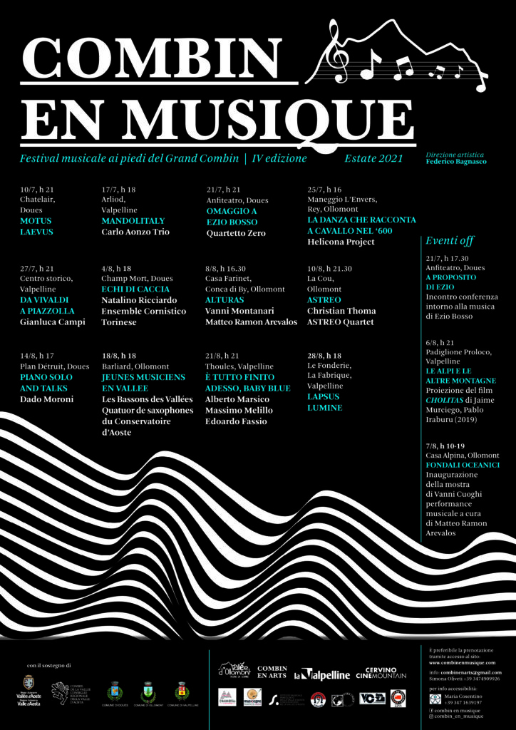 La kermesse Combin en Musique è ideata e curata dall’associazione culturale Combin en Arts, realizzata col sostegno del Consiglio Valle, dell’Assessorato regionale dei Beni Culturali, Turismo, Sport e Commercio e dei Comuni di Doues, Ollomont e Valpelline.