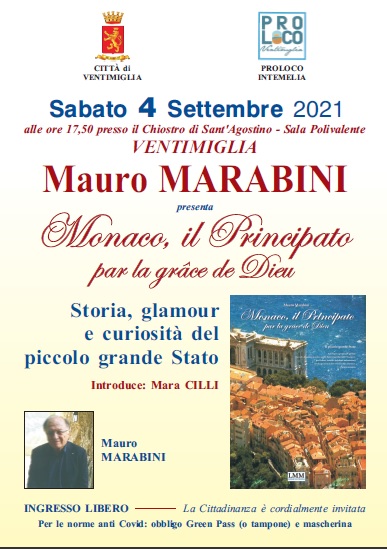 Sabato 4 settembre 2021, alle ore 17.50 presso il Chiostro di Sant’Agostino – Sala Polivalente a Ventimiglia, Mauro Marabini presenta il volume “Monaco, il Principato per la grace de Dieu”.