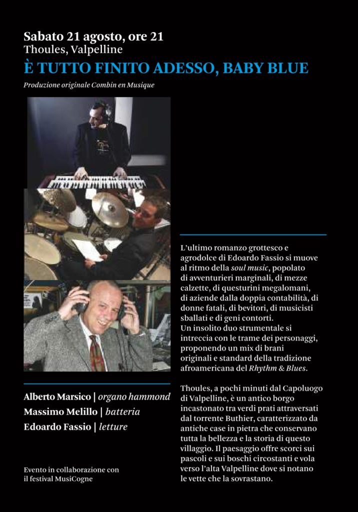 È TUTTO FINITO ADESSO, BABY BLUE dà spettacolo sabato 21 agosto, ore 21, a Thoules, Valpelline, Combin en Musique propone un concerto sui generis. Molti conoscono la formula dell’organ trio, un complesso formato da tre strumentisti – un organista e un batterista ai quali si aggiunge un terzo solista, di solito dedito al sax o alla chitarra, ma pure alla tromba, al vibrafono o al flauto. Il modello rende onore a quella variante cameristica e un po’ underground che prese piede alla fine degli anni 1950 tra sedimenti di jazz club e groove da oratorio battista. Il suo respiro richiama sentori di blues, gospel, funk e soul. Questa volta lo strumento solista è un’opera letteraria, È tutto finito adesso, Baby Blue (96, Rue de-La-Fontaine Edizioni), le sue atmosfere, le sue ambientazioni e i suoi personaggi, in particolare colei che dà il titolo al romanzo, la soul star per caso Linda “Baby Blue” Warren. La storia, che attraversa tre decenni e tre ambientazioni geografiche, esordisce in era thatcheriana in un’immaginaria cittadina del Nord dell’Inghilterra, insegue in Texas l’elusivo sogno americano e culmina in una Torino operaia, apparentemente anonima, impalpabile e immutabile.