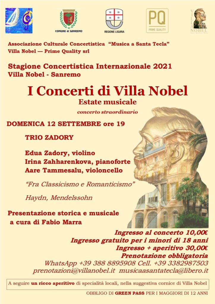 DOMENICA 12 settembre alle ore 19, per la Stagione Concertistica Internazionale 2021 di Villa Nobel, avrà luogo il Concerto straordinario TRIO ZADORY “Fra Classicismo e Romanticismo”, composta da: