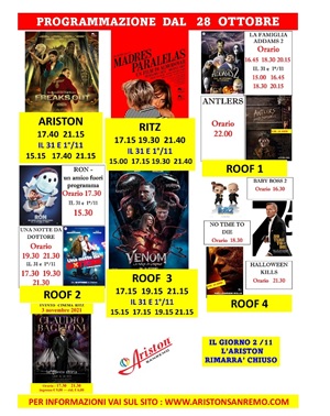 Con la presente comunichiamo che dal 31 ottobre 2021 i cinema di SANREMO effettueranno nuovi orari pomeridiani nelle giornate di domenica e nei festivi : le proiezioni inizieranno dalle ore 15.00 ( a seconda della lunghezza del film).