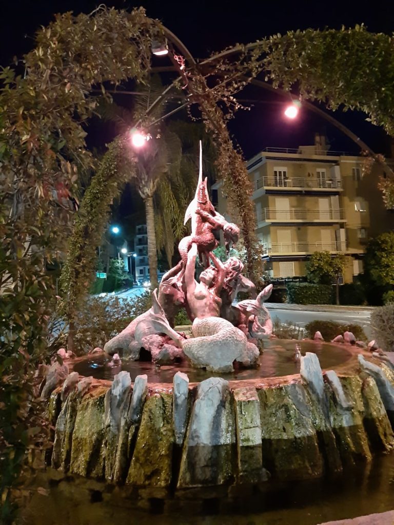 BORDIGHERA – LA FONTANA DELLE SIRENE ILLUMINATA DI ARANCIONE