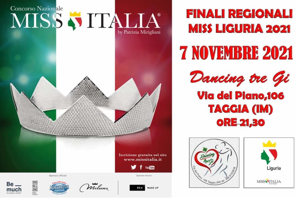 Anche la nostra Regione si appresta ad eleggere la sua Miss Liguria 2021. Domenica 07 novembre alle 21.30 c/o il “ Dancing Tre Gi “ di Taggia, la vincitrice accedera’ alle Pre-finali e Finali Nazionali di Miss Italia 2021 che si svolgeranno a Mestre e Venezia nel mese di Dicembre.