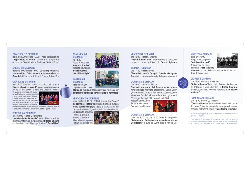 Il Comune di Ospedaletti ha organizzato una serie di eventi in occasione delle festività di fine anno. Si tratta di ben quattordici appuntamenti, il primo dei quali (“Aspettando il Natale” mercatino artigianale a cura dell’Associazione Arte&Party) si è già svolto domenica 12 dicembre lungo la pista ciclopedonale.