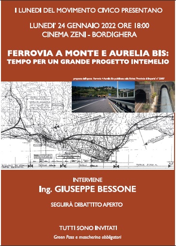 I Lunedi del Movimento Civico ospiteranno lunedi 24 Gennaio alle ore 18:00 al Cinema Zeni la presentazione dell’ing. Giuseppe Bessone: “Ferrovia a monte e Aurelia bis – Tempo per un grande progetto intemelio”.