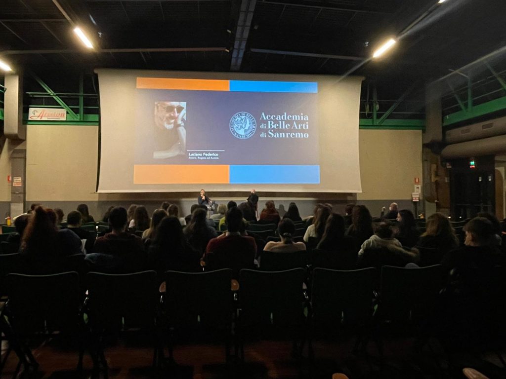 Dopo l’introduzione a cura del Dott.Walter Vacchino ed il saluto del direttore dell’Accademia di Belle Arti di Sanremo Arch. Giampiero Mele; Luciano Federico ha risposto alle domande del moderatore sui temi della scrittura creativa, la genesi di un’idea, i ruoli nel settore della produzione televisiva e cinematografica.