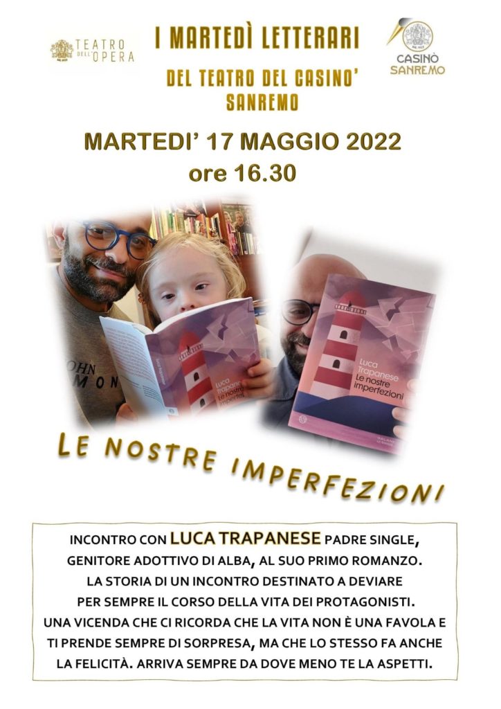 Domani martedì 17 maggio ore 16.30 nel teatro dell’Opera del Casinò di Sanremo Luca Trapanese presenta il libro: “Le nostre imperfezioni” (Salani) . Interviene il gruppo P.E.N.E.L.O.P.E. L’incontro è inserito nel programma di Formazione dei docenti e dei giornalisti. Ingresso libero con mascherina FFp2.