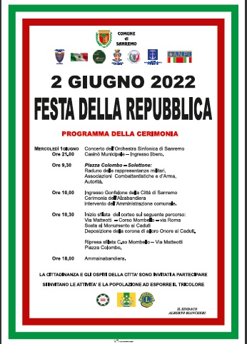 In occasione della Festa della Repubblica, il Comune di Sanremo ha predisposto il seguente programma delle celebrazioni: