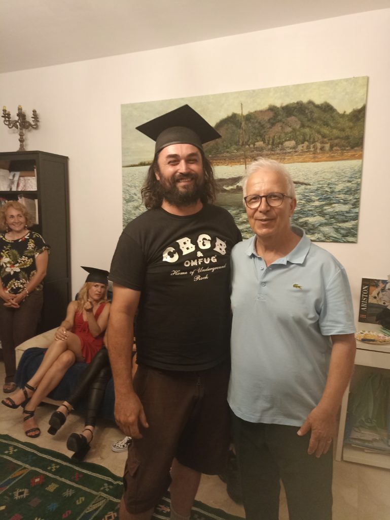 Luca Lo Faro studente marito di Sara: “ Al termine del nostro percorso, tutta la classe è stata invitata dalla nostra cara prof.ssa Francesca Rotta Gentile e dal corpo docente della classe a partecipare a una cena nella magnifica terrazza di casa sua e qui abbiamo avuto splendide sorprese. Infatti durante la cena, era presente anche il poeta libanese Hafez Haidar candidato Nobel per la Pace e la letteratura! E lui in persona, ci ha consegnato il Tocco alla presenza di tutti i nostri docenti, e anche del personale Ata rappresentato dallo storico e insostituibile Salvatore. Fortissime e indimenticabili emozioni. Un grosso e caloroso ringraziamento alla prof.ssa Francesca Rotta Gentile coordinatrice e anima del corso serale , alla prof.ssa di economia Giuseppina Lombardi, anche la seconda prova di economia è andata mediamente molto bene, al prof. di matematica Salvatore Fruet, alla prof. di diritto Raffaella Del Zio, al prof. di inglese Stefano Mulas, alla prof.ssa di francese Viviana Strano, davvero docenti e soprattutto persone uniche che ci hanno saputo accompagnare egregiamente in questi due anni delicati, superando anche le difficoltà della pandemia