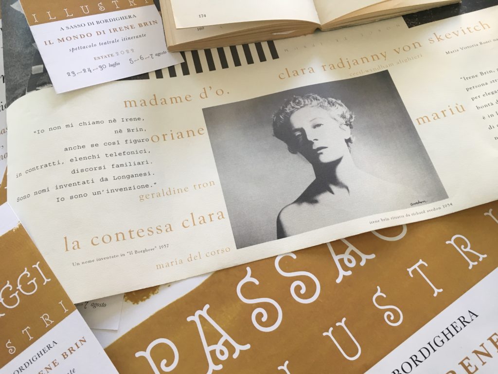 Con leggerezza, ironia ma anche con un’attenta consulenza biografica fornita da Silvia e Simona Alborno e Angela Rossi, le registe Fulvia Roggero e Silvia Villa, restituiranno al pubblico un quadro complessivo di Irene Brin, nome d’arte affidatole da Leo Longanesi, che molti pseudonimi indossò nella sua vita, divertendosi ogni volta ad essere una differente copia di se stessa. Attraverso il gioco del “teatro” si mostreranno i fasti culturali ed artistici che interessarono Bordighera e le sue Frazioni nei secoli passati, mantenendo l’ approccio brillante e interattivo delle precedenti edizioni. In scena gli attori Matteo Cassini, Vanessa Giuliani, Antonella Lercari, Marco Quacchia, Fulvia Roggero, Erika Rotondaro, Silvia Villa.