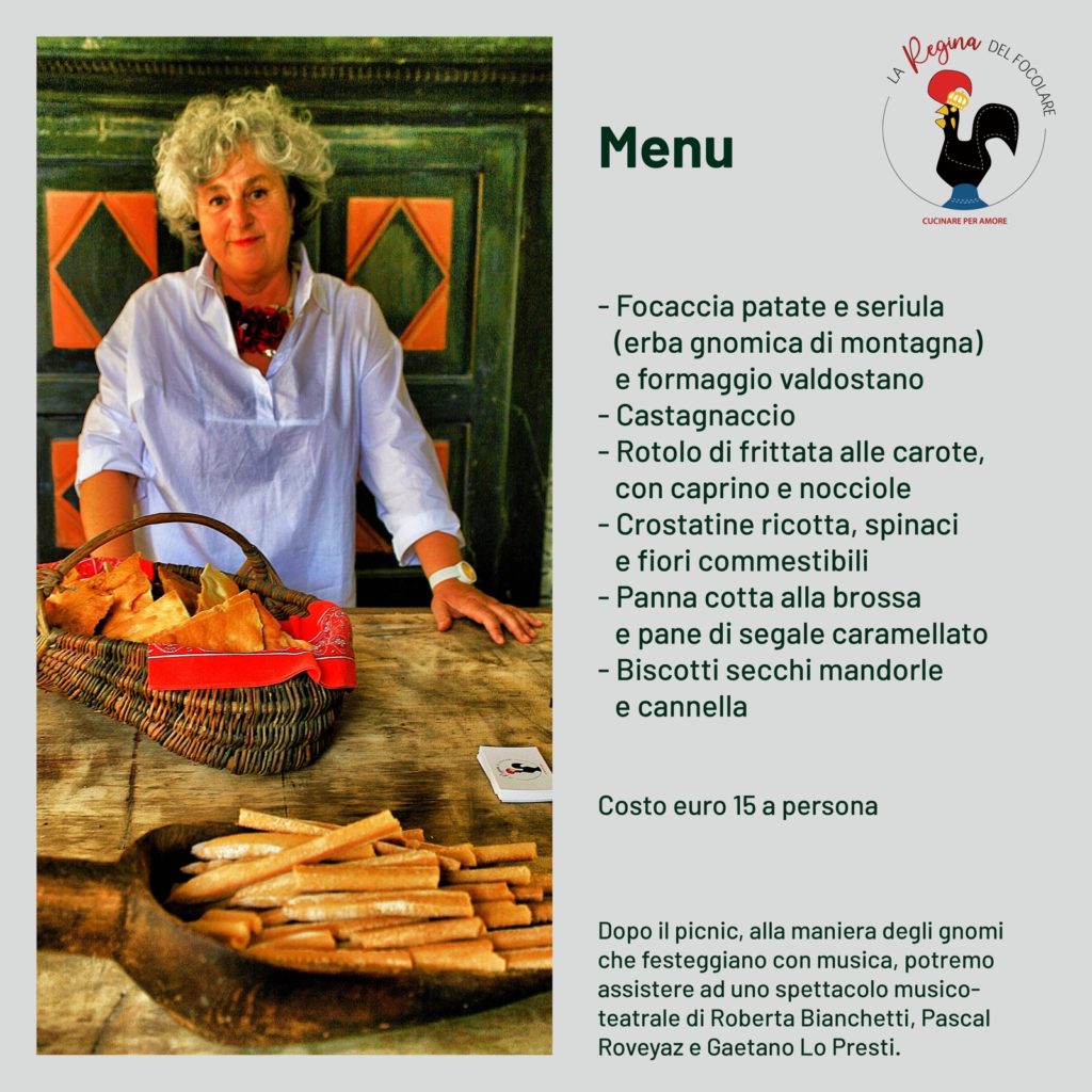 L’appuntamento con i saperi e i sapori è previsto per venerdì 12 agosto alle 12.30 nella formula di un delizioso pic-nic sul prato della Casa Alpina con ricette suggerite dagli gnomi e da Silvia Tavella, food designer e curatrice del blog “La regina del focolare”. Il costo è 15€ a persona, bevande escluse. Prenotazione obbligatoria entro e non oltre domenica 7 agosto. Posti limitati perché gli gnomi si confondono. Prenotazioni al numero 3474909926. Menù: focaccia di patate, seriula e formaggio valdostano, castagnaccio, rotolo di frittata alle carote con caprino e nocciole, crostatine di ricotta, spinaci e fiori, panna cotta alla brossa e pane di segale caramellato, biscotti secchi alle mandorle e cannella. Per informazioni: blog.giallozafferano.it/lareginadelfocolare/