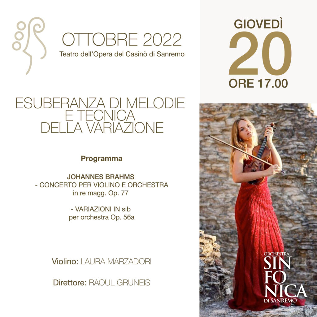 Il primo alle 17.00 al Teatro del Casinò di Sanremo, con un pomeriggio dedicato a Johannes Brahms. Il concerto – “Esuberanza di melodie e tecnica della variazione” – diretto dal M° Raoul Gruneis, vedrà sul palco Laura Marzadori, primo violino dell’orchestra del Teatro alla Scala di Milano, che tiene concerti in tutto il mondo e collabora con i direttori di fama internazionale con il suo violino Giuseppe Fiorini del 1925.