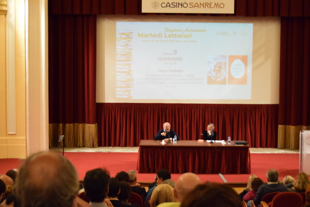 Mercoledì 9 novembre ore 16.30 nel Teatro dell’Opera del Casinò di Sanremo, Oscar Farinetti , fondatore di Eataly e di Green Pea, imprenditore, scrittore e saggista, ha presentato il suo nuovo libro: ”E’ nata prima la gallina..forse…” (Slow Food Editore).