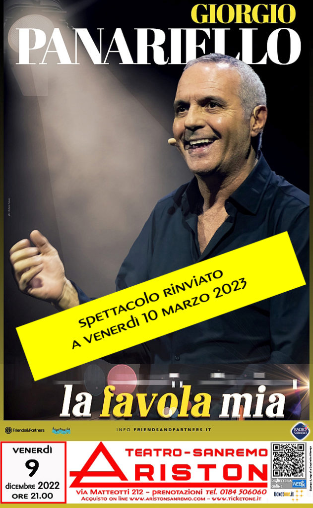 LO SPETTACOLO DI GIORGIO PANARIELLO AL TEATRO ARISTON DI SANREMO E’ RINVIATO A VENERDI’ 10 MARZO 2023