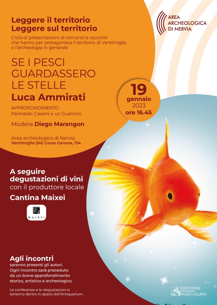 Ospite del nuovo incontro sarà Luca AMMIRATI con il suo “Se i pesci guardassero le stelle” e a dialogare con l’autore sarà Diego Marangon, attore e regista teatrale che da anni si occupa di cultura sul territorio con l’Associazione Culturale LIBER THEATRUM, preceduto da un breve intervento di approfondimento archeologico e storico artistico ispirato dal libro, a cura di Valentina Fiore (figura di spicco del Polo Museale e tra le altre cose Direttore dell’Area Archeologica di Nervia) dal titolo “Perinaldo: Cassini e un Guercino”.