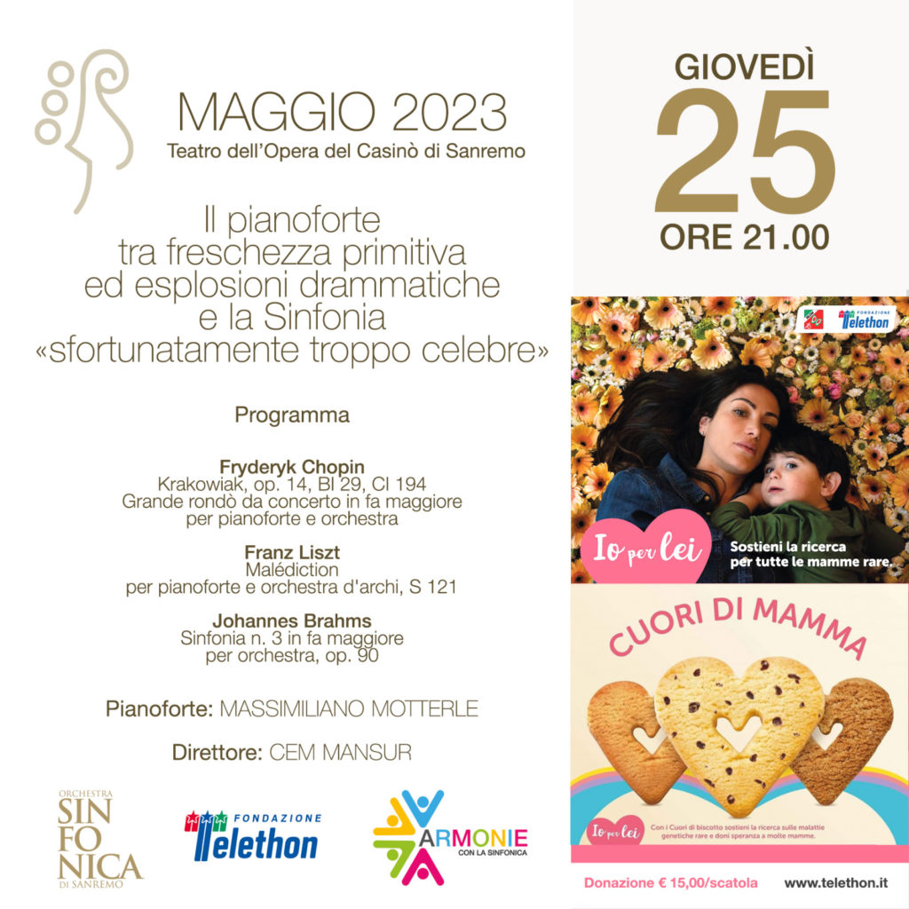 Il concerto fa parte del progetto “Armonie con la Sinfonica”. il 50% del ricavato della serata sarà devoluto alla Fondazione Telethon per sostenere la ricerca sulle malattie genetiche rare e donare una speranza a molte mamme. A fine serata sarà possibile acquistare anche le box regalo con i buonissimi “Cuori di biscotto Telethon”. Presente in sala e al corner dedicato Anna Famà, del Coordinamento Telethon Imperia, per illustrare i progetti della Fondazione.