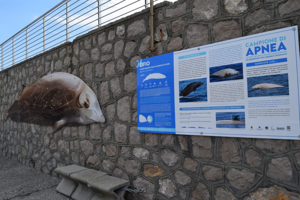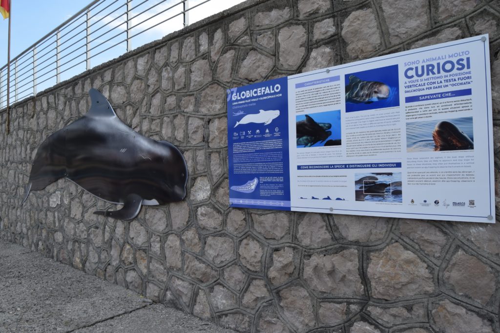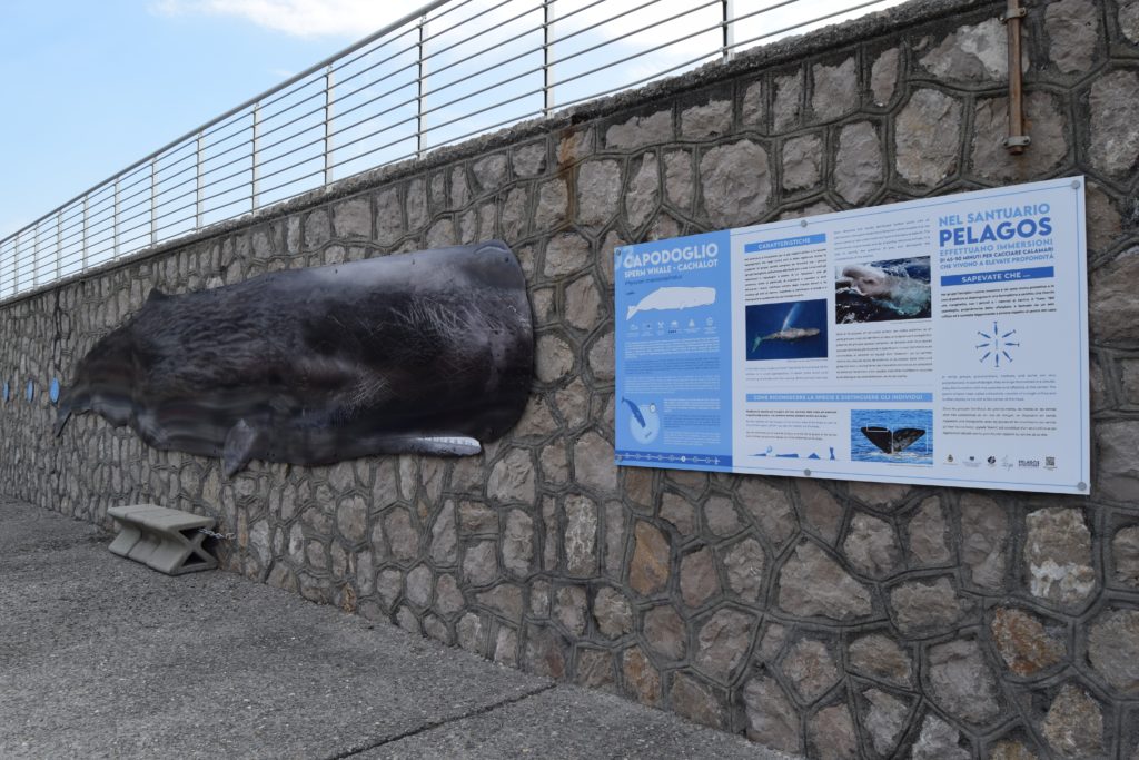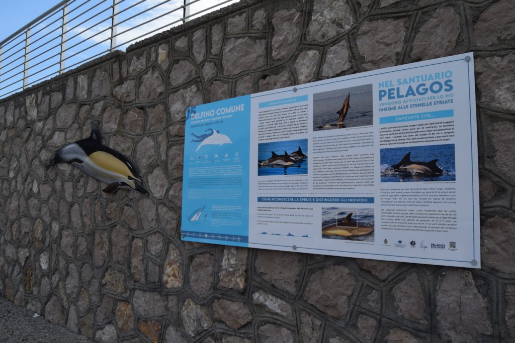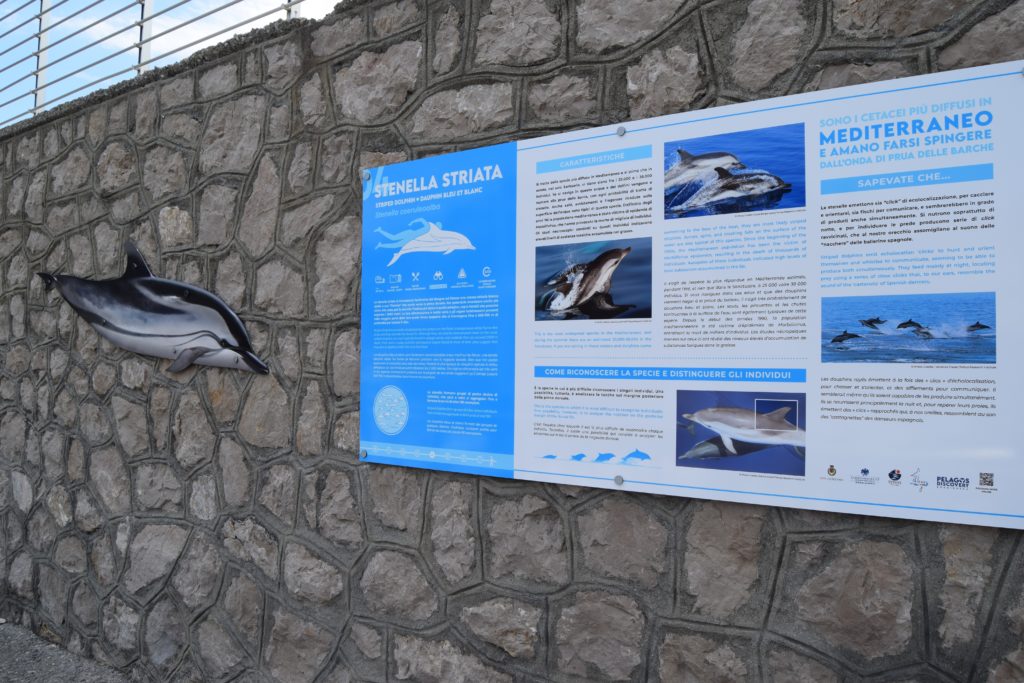 L’installazione lungo il livello intermedio della diga foranea del porto di Bordighera è composta da sagome a dimensioni naturali, in scala 1:1, con i disegni naturalistici delle otto specie di cetacei che vivono nel Mar Mediterraneo e da 10 pannelli di 2 metri per uno. I primi due, a carattere introduttivo, presentano il Santuario Pelagos e i cetacei presenti nei nostri mari, le diverse possibilità di incontrare i cetacei in mare e come farlo senza disturbarli per mitigare il disturbo ai cetacei arrecato dalle imbarcazioni. Una parte è inoltre dedicata a “guidare” i visitatori nella lettura degli altri otto pannelli, che a fianco di ogni sagoma di cetaceo forniscono informazioni e curiosità sulle diverse specie attraverso contenuti testuali in tre lingue (italiano inglese e francese), infografiche e immagini fotografiche. Un QRcode sui pannelli e su tutto il materiale informativo invita i visitatori a visitare il sito www.pelagosdiscovery.it per approfondimenti ed ulteriori informazioni.