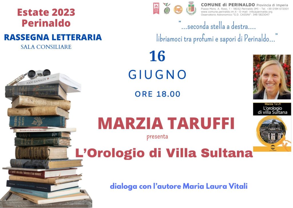 Dopo il felice esordio di venerdì scorso con il partecipato Convegno “Messaggi cifrati in casa Calvino”, la rassegna letteraria “Seconda stella a destra…Libriamoci tra sapori e profumi a Perinaldo”, organizzata dal Comune, prosegue con il secondo appuntamento, in programma venerdì 16 giugno, alle ore 18, nella Sala Consiliare del Comune. Protagonista è la giornalista e scrittrice Marzia Taruffi che presenta la sua ultima pubblicazione “L’orologio di Villa Sultana” (Golem Editore).