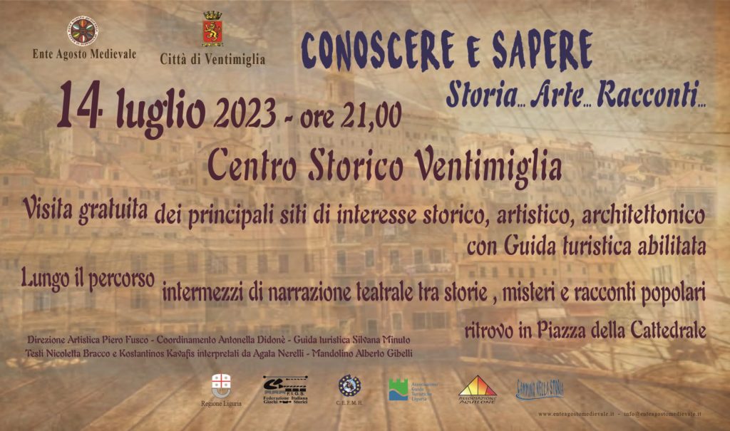 L’Ente Agosto Medievale, in collaborazione con il Centro Culturale Sala delle Volte, dà il via ad un nuovo progetto Culturale “Conoscere e Sapere, Storia… Arte… Racconti…” legato alla promozione e valorizzazione del patrimonio Storico, Artistico e al mantenimento delle tradizioni che Ventimiglia possiede.
