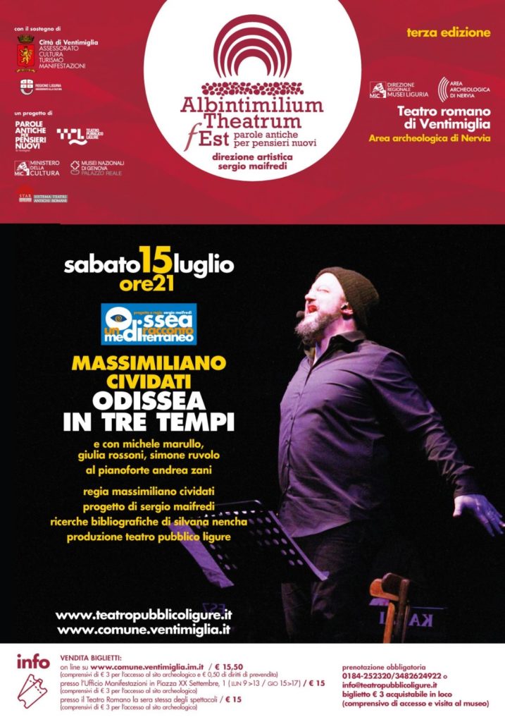 Il Festival prosegue sabato 15 luglio alle 21 con “Odissea in tre tempi”, nuova produzione di Teatro Pubblico Ligure con Massimiliano Cividati, attori e musicisti diretti da Sergio Maifredi.