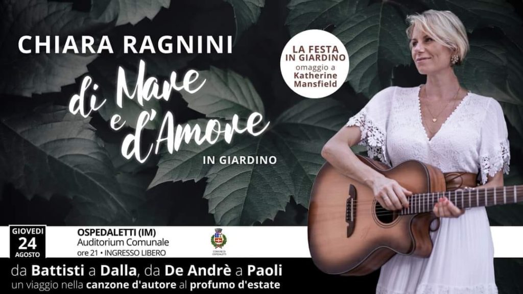 Giovedì 24 agosto: alle 21,30 presso l’Auditorium “La Festa in Giardino” omaggio a Katherine Mansfield ‘Di Mare e d’Amore’. Viaggio nella canzone d’autore al sapore di sale con protagonista Chiara Ragnini cantautrice genovese