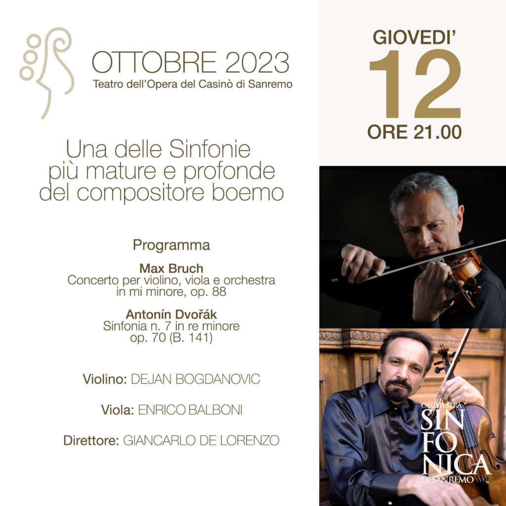 “Una stagione che proseguirà il viaggio musicale iniziato nel 2022” spiega il direttore artistico M° Giancarlo De Lorenzo “Quest’anno esploreremo il Romanticismo e le Scuole Nazionali. Inizieremo domani sera con Max Bruch con il Concerto per violino, viola e orchestra in mi minore, op. 88. Un’opera del 1911 dallo stile tardo romantico, rapsodico, che si ispira, tra l’altro, al Doppio Concerto per violino, violoncello e orchestra, di Brahms. Proseguiremo con la Sinfonia n. 7 in re minore op. 70 di Antonín Dvořák. Un’opera nata da un viaggio… Il compositore ceco infatti nel 1883 fu chiamato in Inghilterra dalla Società Filarmonica di Londra per eseguire alcune sue composizioni, fra cui la sesta sinfonia. Il successo fu enorme e a Dvorak fu commissionata una nuova sinfonia, che terminò e presentò al pubblico nel 1885 al St. James Hall di Londra. Come le precedenti, anche questa sinfonia è attraversata da echi di musiche popolari boeme, ma qui l’influsso di Brahms, nella ricerca dell’equilibrio formale, è trasparente. Un’opera che si conquistò un titolo – ‘del tempo torbido’ – che ne riassume il carattere piuttosto austero, a tratti tragico”.