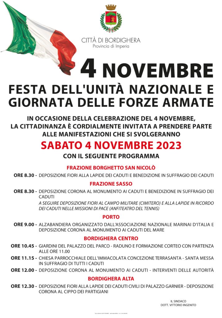 Il Comune di Bordighera rende noto il programma delle celebrazioni in occasione del 4 Novembre, Festa dell’Unità Nazionale e Giornata delle Forze Armate.