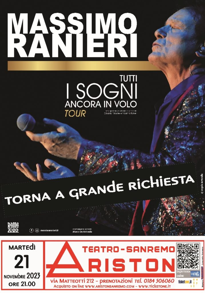 Riprende il viaggio di Massimo Ranieri, insieme al suo pubblico, con il nuovo spettacolo “TUTTI I SOGNI ANCORA IN VOLO” Dopo piu’ di 800 repliche di “SOGNO E SON DESTO” ecco un’ altra straordinaria avventura tra canto, recitazione, brani celebri, sketch divertenti e racconti inediti. Tra le tante canzoni ci sarà anche il brano vincitore del PREMIO DELLA CRITICA a Sanremo 2022, “LETTERA DI LA DAL MARE”. Ascolteremo anche bellissimi inediti scritti per Ranieri da alcuni grandi cantautori italiani tra i quali: Pino Donaggio, Ivano Fossati, Bruno Lauzi, Giuliano Sangiorgi e molti altri, canzoni che fanno parte del suo nuovo Album, che ha lo stesso titolo dello spettacolo, uscito il 18 novembre, che porta la firma della produzione musicale di Gino Vannelli. Anche questa volta ci sarà un Massimo al 100% ,che offrirà al suo pubblico tutto il meglio del suo repertorio piu’ amato e prestigioso. Lo spettacolo si veste di una nuova veste scenografica, l’organizzazione generale della produzione è di Marco De Antoniis, con una band di musicisti inedita dove possiamo trovare al pianoforte Seby Burgio, alle tastiere e voce : Giovanna Perna, al basso Pierpaolo Ranieri, alla batteria Luca Troll, percussioni di Arnaldo Vacca, alle chitarre Andrea Pistilli e Tony Puja, violino e voce: Valentina Pinto e ai fiati troviamo il sax di Max Filosi e la voce e il sax di Cristiana Polegri.