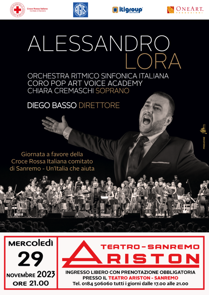 Il 29 novembre 2023 alle ore 21.00 al Teatro Ariston di Sanremo (Imperia) il tenore ALESSANDRO LORA sarà protagonista di un concerto lirico e benefico realizzato per raccogliere fondi a favore della Croce Rossa di Sanremo insieme al soprano Chiara Cremaschi, al coro Art Voice Academy e all’Orchestra Ritmico Sinfonica Italiana diretta dal M° Diego Basso.