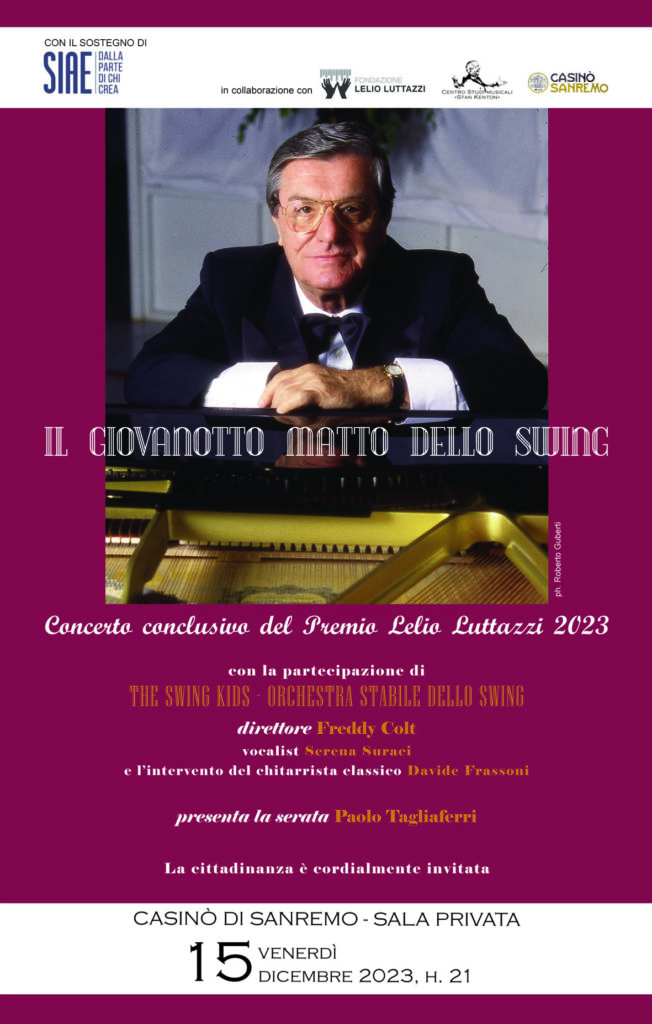 Venerdì 15 dicembre al Casinò di Sanremo (Sala Privata, ore 21, presenta Paolo Tagliaferri) una serata speciale a conclusione del Premio Lelio Luttazzi 2023, con la partecipazione di Swing Kids, Orchestra Stabile dello Swing, formata dai migliori giovani talenti del jazz e diretta da Freddy Colt, con la vocalist Serena Suraci e l’intervento del chitarrista classico Davide Frassoni. Arrangiamenti del Maestro Lelio Luttazzi e del Maestro Antonello Capuano.