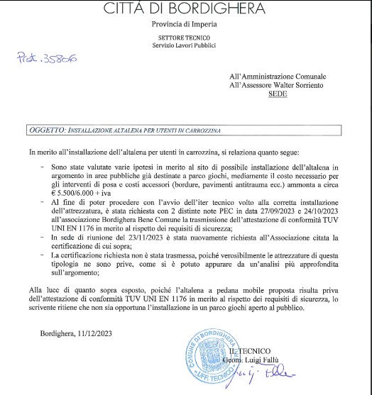 L’Ufficio Tecnico del Comune di Bordighera, come da relazione inviata in data odierna all’Amministrazione, ritiene che non sia opportuno installare in un parco giochi aperto al pubblico l’altalena per utenti in carrozzina offerta dall’associazione “Bordighera Bene Comune”. Questo poiché l’attrezzatura a pedana mobile proposta risulta priva dell’attestazione di conformità TUV UNI EN 1176 in merito al rispetto dei requisiti di sicurezza; scrive in particolare l’Ufficio che “la certificazione richiesta non è stata trasmessa poiché verosimilmente le attrezzature di questa tipologia ne sono prive, come si è potuto appurare da un’analisi più approfondita sull’argomento”.