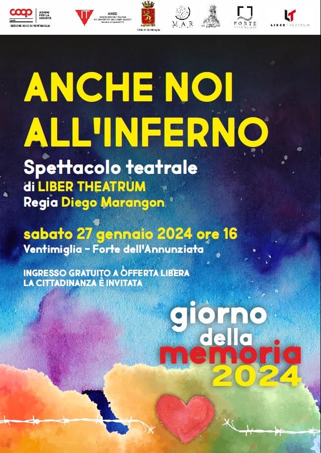 Sabato 27 Gennaio alle ore 16.00 – con ingresso gratuito a offerta libera, nelle belle sale sotterranee del Museo Civico Archeologico al Forte dell’Annunziata, con lo spettacolo “ANCHE NOI ALL’INFERNO” regia Diego Marangon, in occasione della Giornata della Memoria, inserito negli eventi realizzati in collaborazione con COOP Liguria, con il patrocinio della Città di Ventimiglia e per la prima volta anche di ANED: Associazione Italiana ex Deportati nei Campi Nazisti di Savona e Imperia.