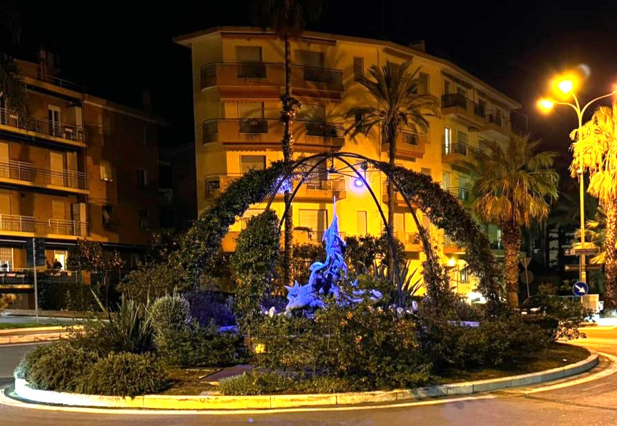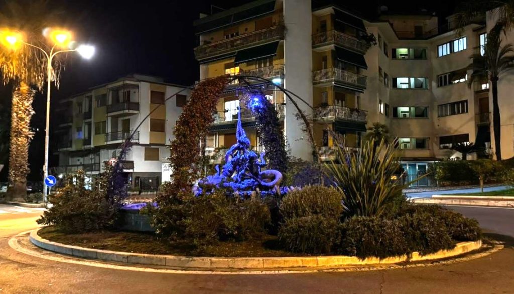 BORDIGHERA – FONTANA DELLE SIRENE ILLUMINATA DI VIOLA
