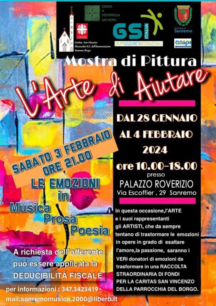Una serata unica, speciale dove le Arti e gli Artisti si uniranno in un abbraccio a conclusione di questa prima edizione di ” L’Arte di Aiutare ” nella città dei fiori e della musica, dell’arte: una importante mostra di pittura e di solidarietà , che termina domenica 4 febbraio-ore 18:00. Artisti di alto livello hanno offerto le loro opere per una nobile causa. In scena ci saranno . Gigi Boellis alla chitarra, Roberto Crespi al sax, Erica Martini al pianoforte.