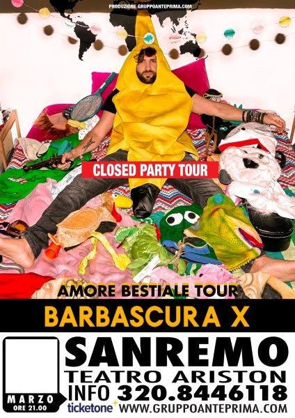 Mercoledì 20 marzo (ore 21.00), il chimico e divulgatore scientifico da un milione di follower sul web, BARBASCURA X, sarà protagonista al Teatro Ariston di Sanremo con l’ultima tappa del suo “AMORE BESTIALE TOUR” in cui unisce cultura e divertimento. Biglietti disponibili in prevendita sul circuito online Ticketone.