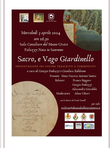 Verrà presentata mercoledì 3 aprile, alle 16.30, nella sala consiliare del museo civico di Palazzo Nota, “Sacro, e Vago Giardinello“, la trascrizione di un testo sacro del 1600 di particolare interesse e pregio attinente la cultura e la storia locale del Ponente ligure.