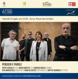 Alle 21.30 sul palco si esibiranno i 5 grandi musicisti jazz Javier Girotto (sax), Fabrizio Bosso (tromba), Rita Marcotulli (pianoforte)e Mattia Barbieri (batteria). Alla voce Peppe Servillo.
