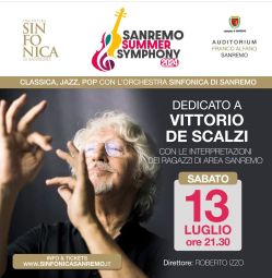 Sempre in Liguria, sabato 13 luglio alle ore 21.30 all’Auditorium Franco Alfano di Sanremo (Imperia), nell’ambito della Sanremo Summer Symphon, si terrà una serata dedicata a Vittorio De Scalzi e alle sue canzoni interpretate dai ragazzi di Area Sanremo e dall’orchestra Sinfonica di Sanremo. Il concerto è diretto dal Maestro Roberto Izzo.
