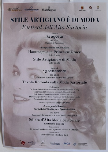 SABATO 31 AGOSTO 2024 ALLE ORE 18.00 AL CASINO’ DI SANREMO L’INAUGURAZIONE DELLE MOSTRE “HOMMAGE A LA PRINCESSE GRACE” E “STILE ARTIGIANO E’ DI MODA” – EVENTO DI CONFARTIGIANATO DEDICATO ALLA SARTORIA ARTIGIANALE ITALIANA