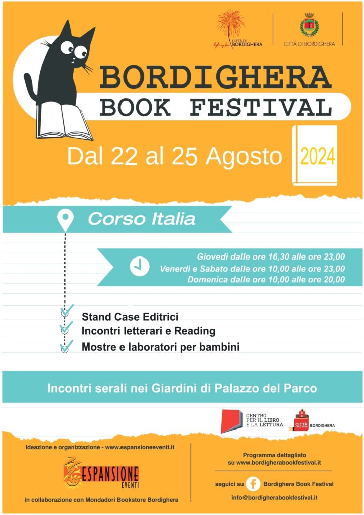Da giovedì 22 agosto a domenica 25 agosto 2024 si svolgerà l’ 11° edizione del BORDIGHERA BOOK FESTIVAL (giovedì ore 16,30 -23,00; venerdì e sabato ore 10,00 – 23,00; domenica 10,00 -20,00).