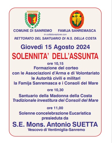 La “Solennità dell’Assunta” è organizzata, come ogni anno, dal Comune di Sanremo e dalla Famija Sanremasca in collaborazione con il Rettorato del Santuario N.S. della Costa.