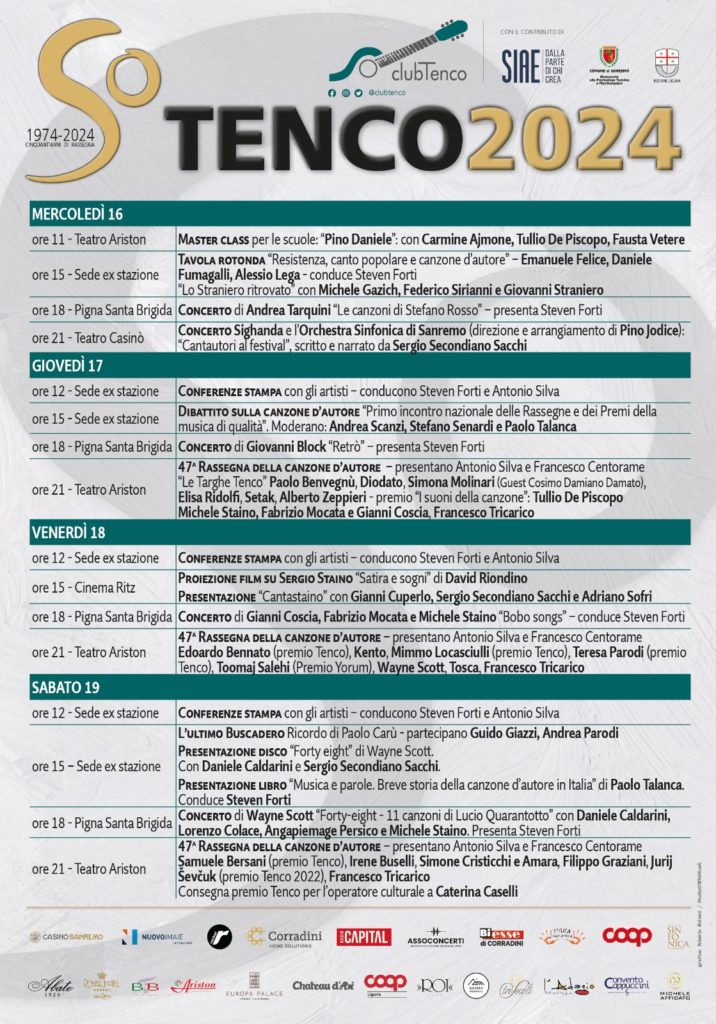 Da giovedì 17 ottobre, a sabato 19 ottobre a Sanremo (Imperia) si tiene il Premio Tenco 2024. La rassegna dedicata alla Canzone d’Autore più prestigiosa e rinomata del nostro Paese quest’anno celebra l’importante traguardo dei 50 anni.