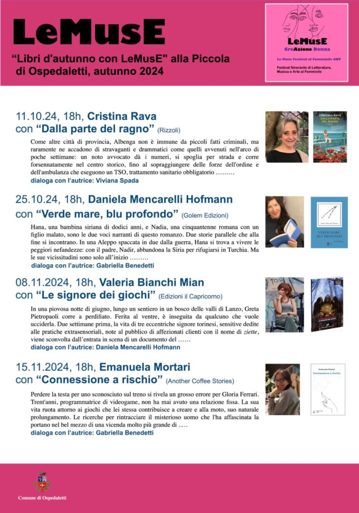Rassegna letteraria – L’organizzazione di Volontariato Le MusE prosegue il suo percorso culturale con la rassegna letteraria “Libri d’Autunno con Le MusE” che si terrà dall’11 ottobre al 15 novembre, alle ore 18.00, presso ‘La Piccola’ (ex scalo merci) di Ospedaletti. Come detto, si comincia l’11 ottobre con Cristina Rava che presenta il suo ultimo giallo “Dalla parte del ragno”. Gli altri appuntamenti sono in calendario il 25 ottobre con “Verde mare, blu profondo” dell’autrice Daniela Mencarelli Hofmann, l’8 novembre con “Le signore dei giochi” di Valeria Bianchi Mian e si chiuderà il 15 novembre con Emanuela Mortari e il suo romanzo “Connessione a rischio”. Al termine di ogni incontro verrà offerto un aperitivo ai presenti.